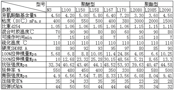 說明: 1.建議模具溫度控制為100℃左右;后硫化溫度為90-110℃左右。 2.L100、L150膠,用于陶瓷模具時,具有特強的抗粘粉性能。 3.酯型PU膠在常溫下粘度較大,使用前最好先烘烤。 4.用于陶瓷模具時,建議靜壓模使用優(yōu)良耐油的聚酯型PU膠,普通模使用優(yōu)良耐水的聚醚型PU膠。 5.在實際提供的PU膠時,NCO可能在有±0.1%的變化范圍,固化劑需做相應的調(diào)整,其性能不受影響。 6.如需特殊用途PU膠,請來電咨詢。